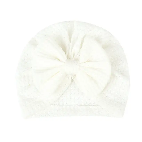The newest style in baby turbans with a beautiful waffle texture soft stretch fabric and large knot bows in the centre and stylish textured fabric in bright trendy colors. Size appropriate for 0-2 yr old.