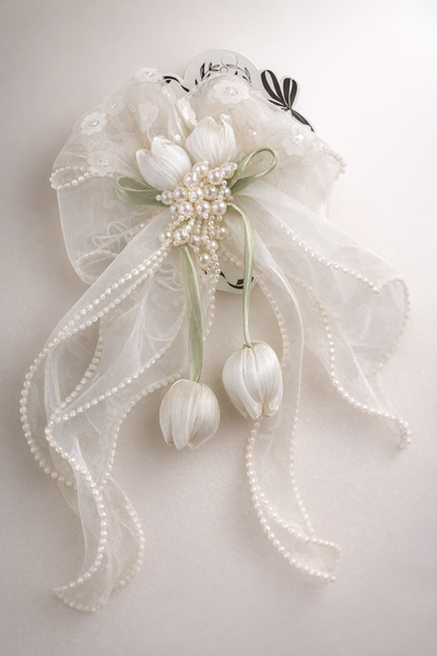 Delicate, dreamy, and oh-so-elegant – these handcrafted tulip bloom hair clips are a timeless accessory for your little one or even for yourself! Featuring soft satin tulip buds in pastel pink and ivory, accented with lush green ribbon leaves and cascading pearl strands, each clip brings a touch of charm and grace to any hairstyle. Whether it’s a festive occasion, photoshoot, or a dreamy outfit detail, these clips are the perfect finishing touch.